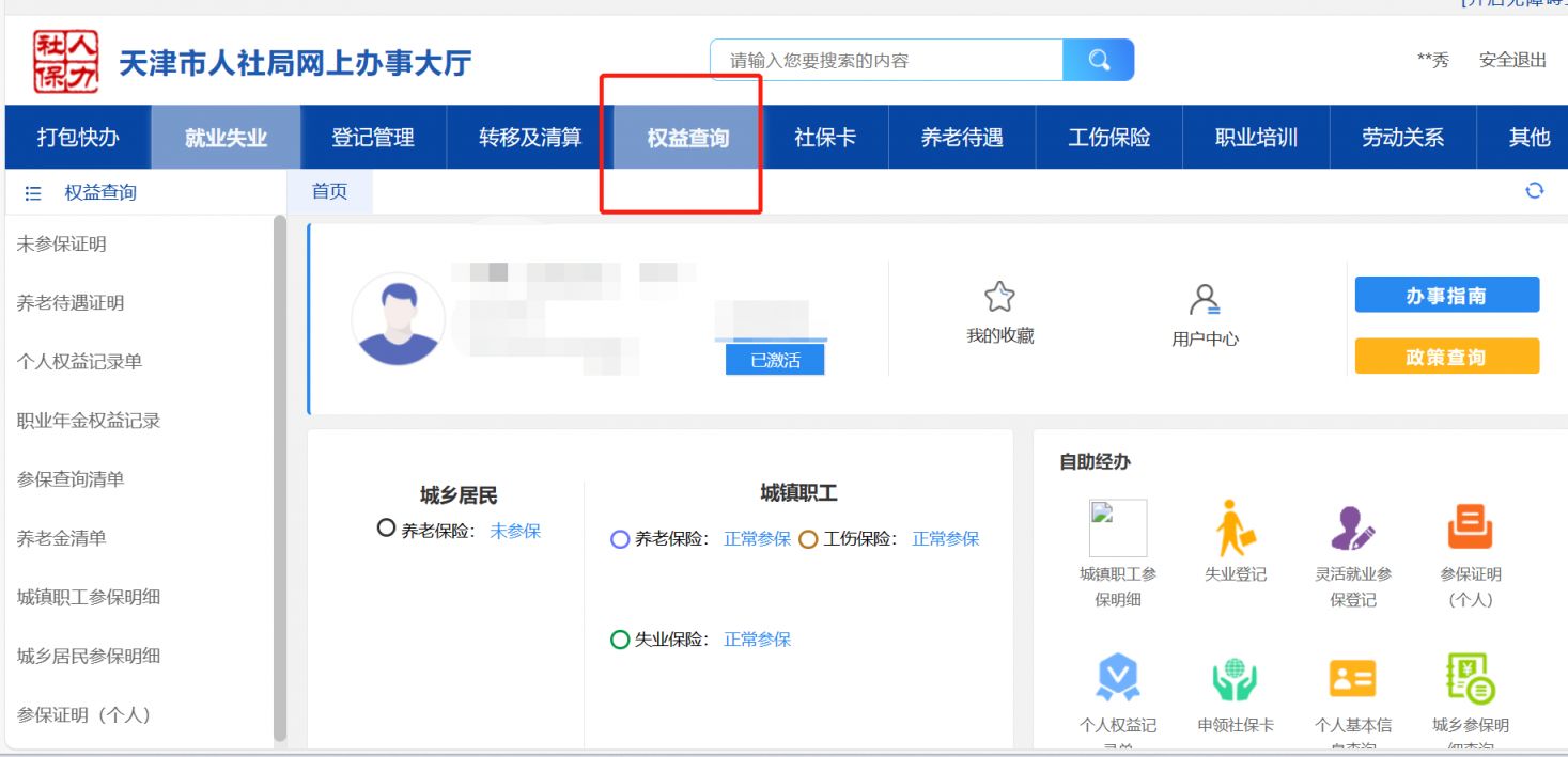 进入天津市社保局官网后,登录个人社保网上服务系统,然后点击“权益查询”—“参保查询”、”城职职工参保明细“等自己的社保详细信息。
