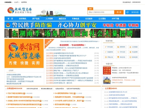• 永城信息港,河南省永城市生活类信息网站,宗旨以宣传永城、服务百姓、传递价值为目的;栏目设置:人才招聘、房产信息、车辆信息、交友征婚、供求商机、生活服务、招生信息、热点快讯等。